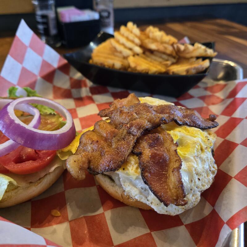Burger topped with jack cheese, crispy bacon, fried egg & chipotle mayo. Wth lettuce, tomato, pickle & onion.