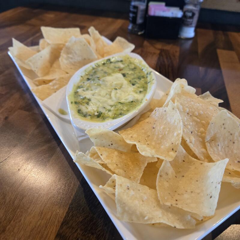 Melted white american cheese, parmesan, mozzarella, gouda, sauteed spinach & artichoke hearts. Served with fresh tortilla chips
